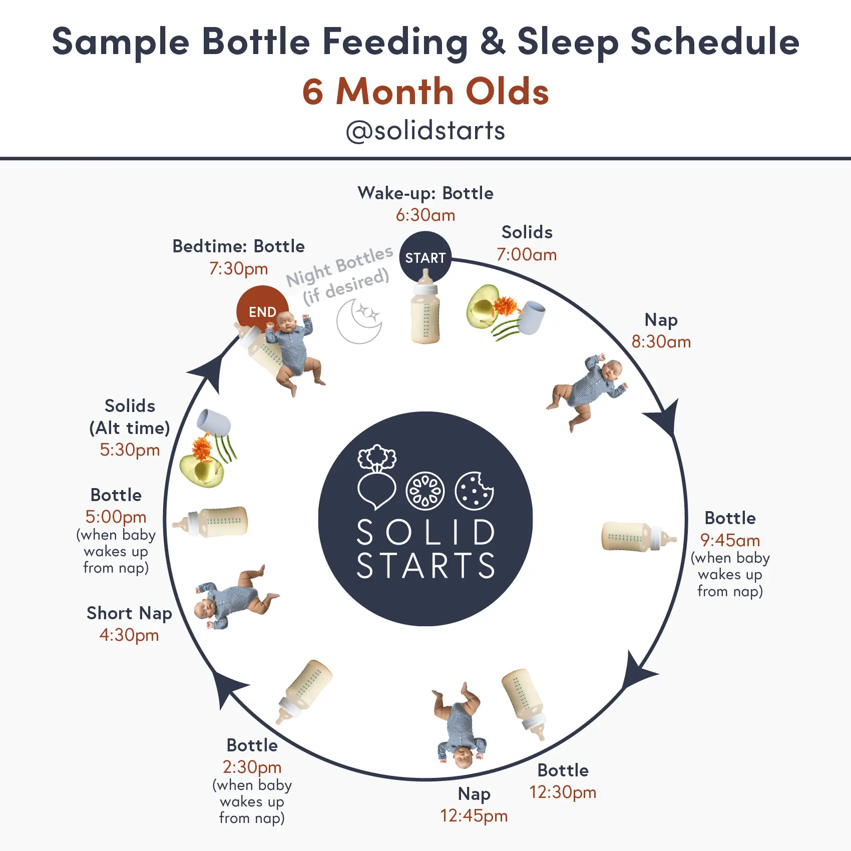 Use this schedule as a starting point and adapt in a way that works for you and baby. It is okay if your baby’s routine differs. You can trust that your plan is working as long as baby is regularly peeing and pooping, and baby is growing with themselves as their own benchmark. If you breastfeed on demand, try to offer solid food around 30 minutes after nursing. As always, discuss your plan with your medical provider as questions come up.