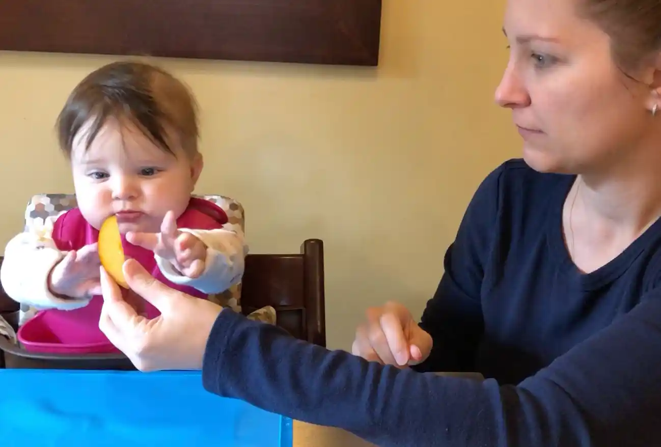 Beth, 6 months old, and her mother practice responsive spoon feeding.