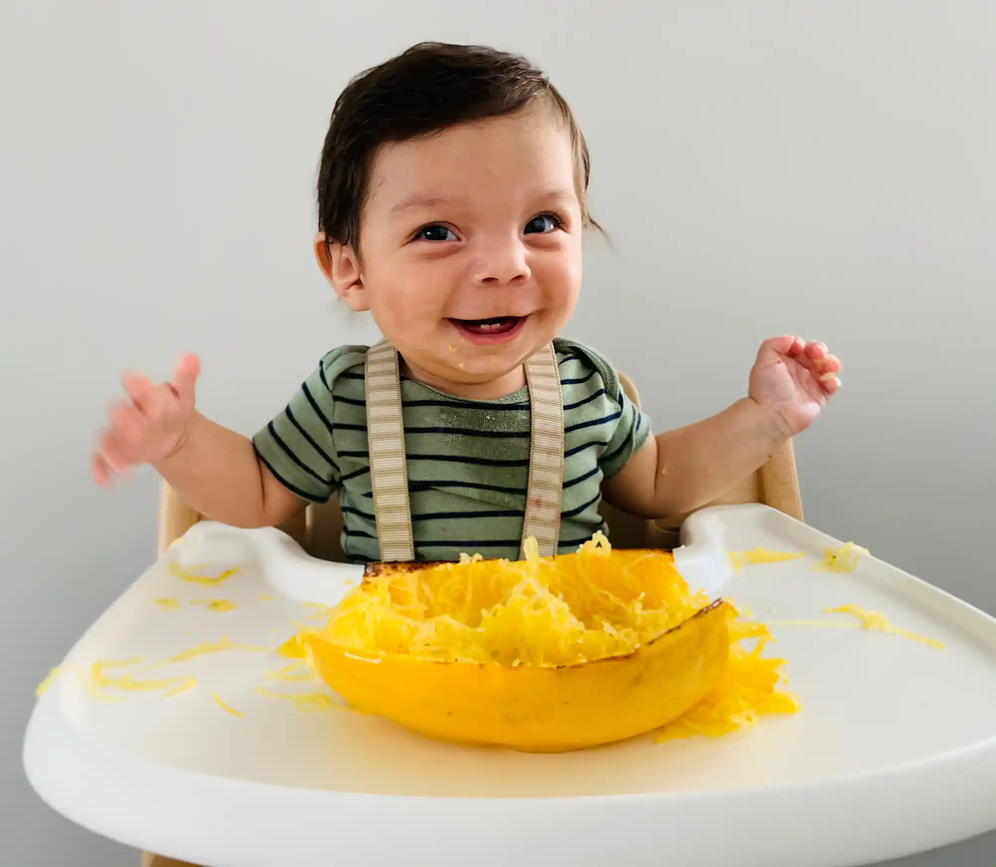 Touching, squishing, smearing, and playing with food inevitably leads to a mess and unfortunately, some food waste, too. This is another reason to keep portions small at the start of mealtime—and to use tactics to minimize the mess like laying a splat mat (or a large trash bag) on the floor below their high chair. Try to resist any urge to wipe your baby’s face and hands as they dig in. At this age, babies need to explore food at their own pace to build the skills to eventually eat it. Cleaning as they eat can distract them and lead to negative associations with mealtimes.