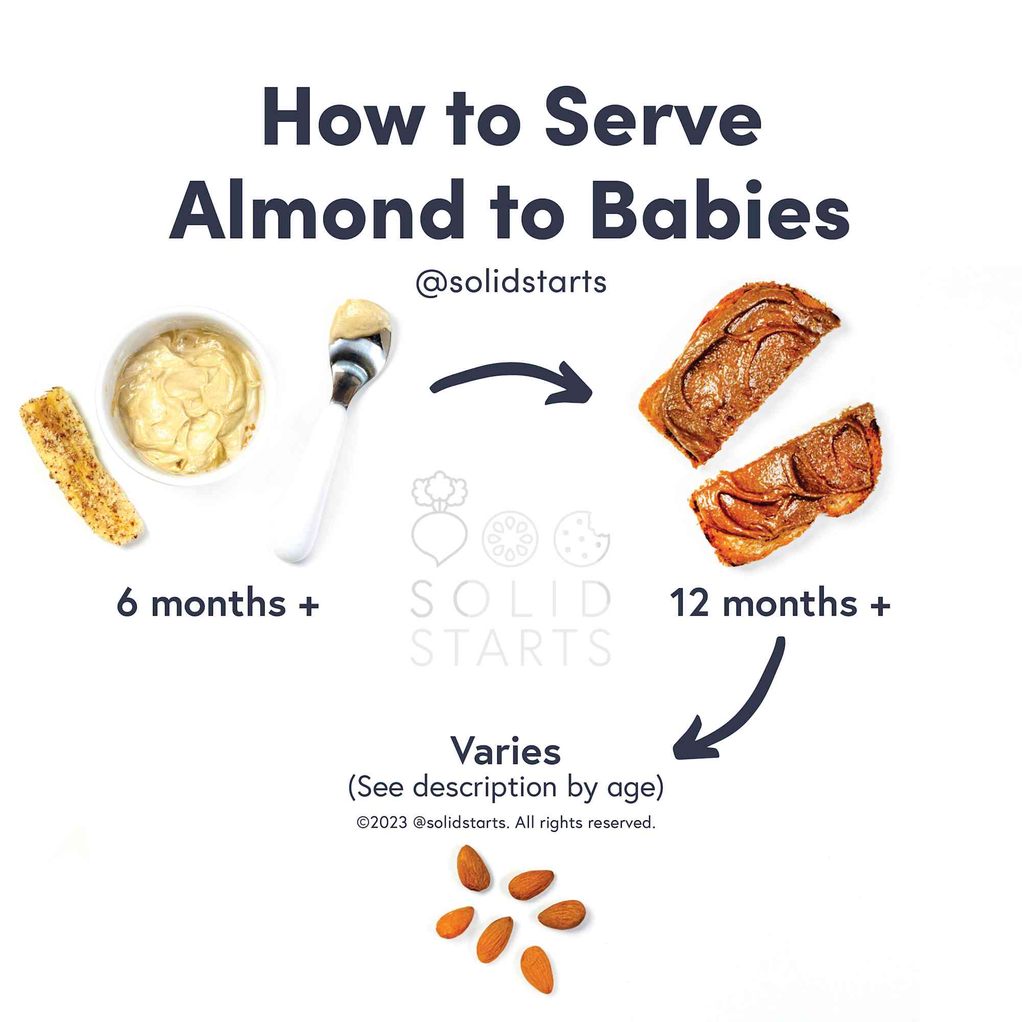 Almonds, if they are finely ground or offered in the form of a smooth, thinned out nut butter, may be introduced as soon as baby is ready to start solids, which is generally around 6 months of age. Whole almonds, chopped almonds, and almond butter are choking hazards for babies and children, so read our preparation by age section closely before serving.