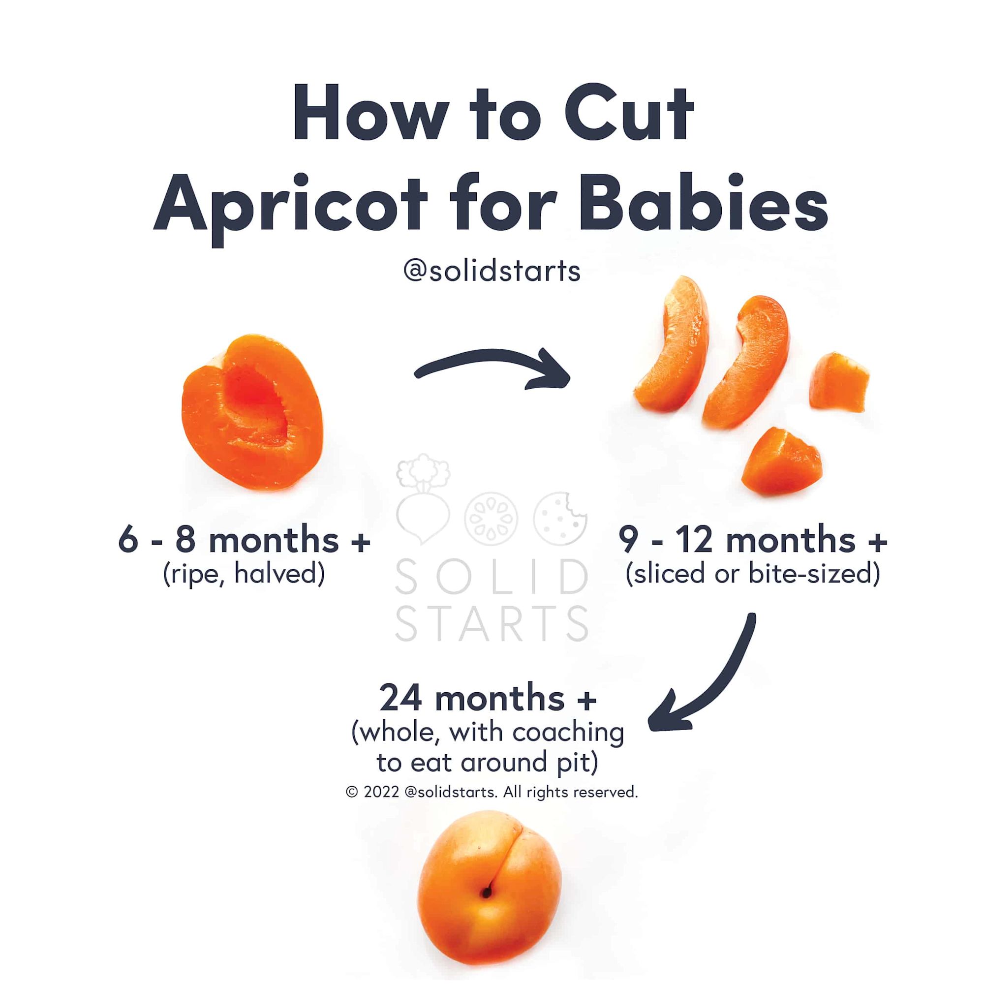 Yes. Apricots contain a hard pit inside and, especially when underripe, are slippery and can be firm, qualities that increase the risk of choking. To reduce the risk, prepare and serve apricots in an age-appropriate way as described in the How to Serve section. As always, make sure you create a safe eating environment and stay within an arm’s reach of baby during meals.