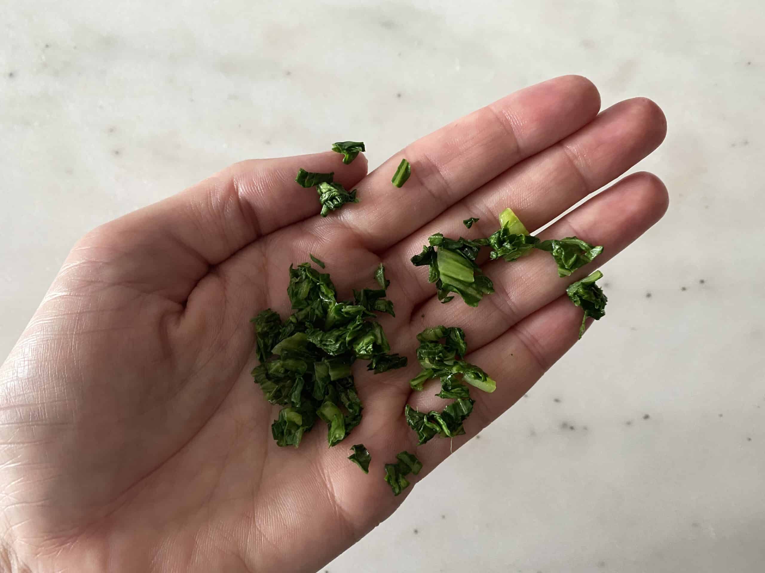 Separating bok choy leaves from the stems and mincing.