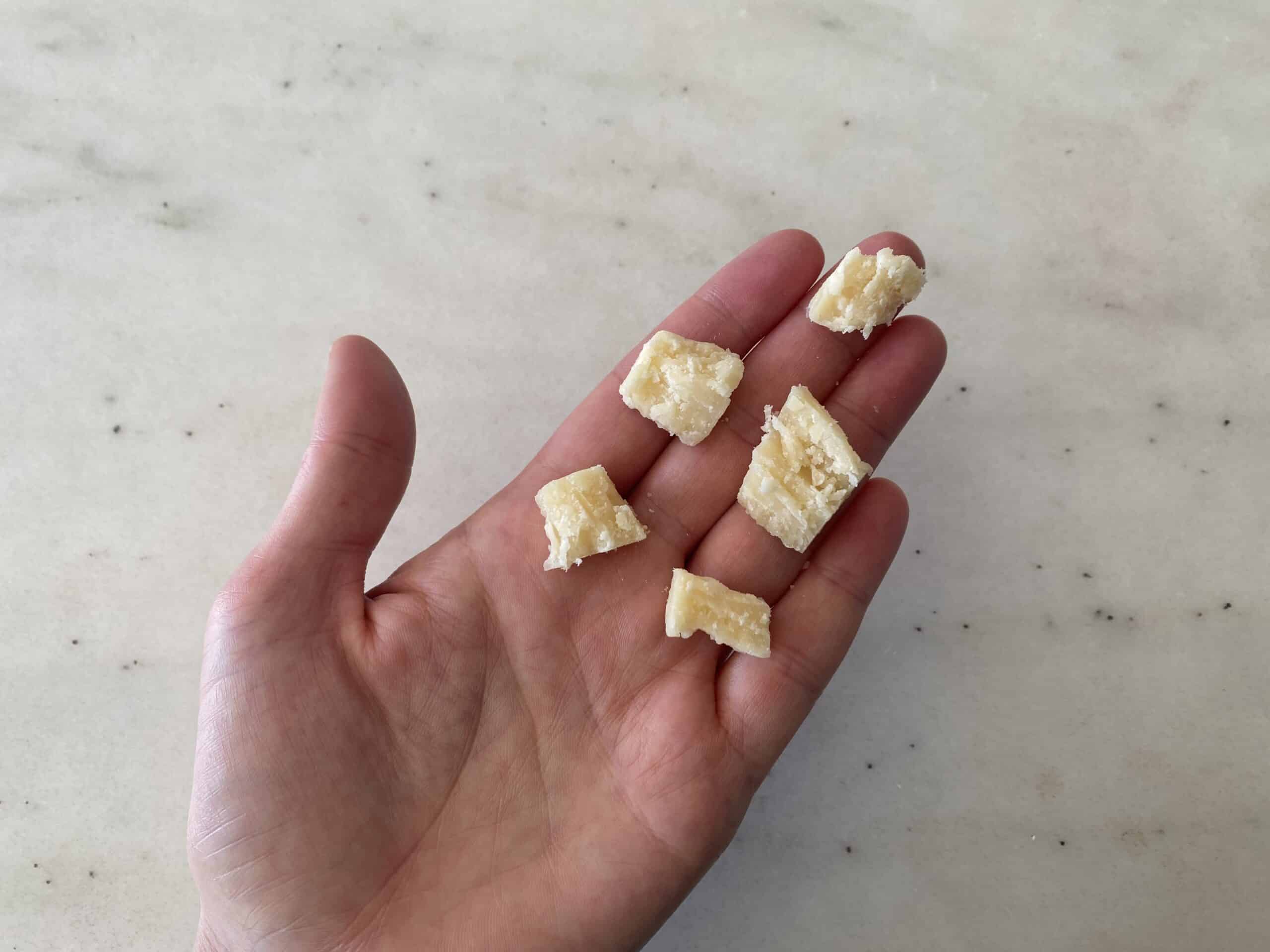 Serve pasteurized parmesan in moderation: in flat bite-sized pieces, long flat slices, or as grated or shredded cheese. Continue to mix shredded or grated parmesan into shared dishes or sprinkle on top of the child’s meals. Avoid serving parmesan in cubes or large crumbles, as these present an increased choking risk.