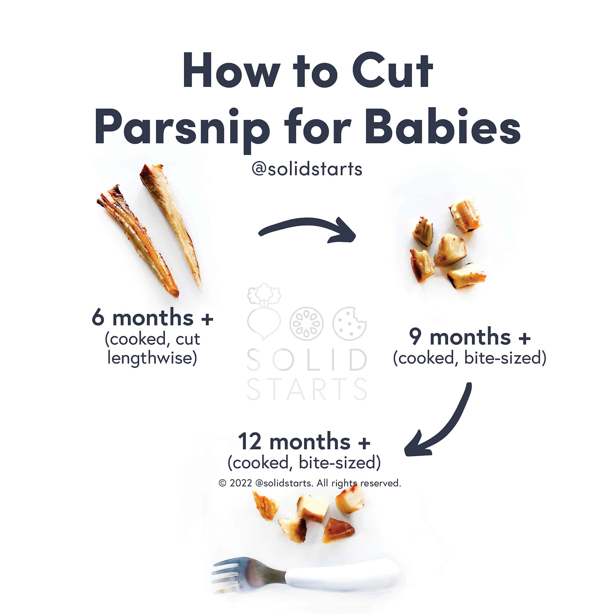 Offer large, long pieces of cooked parsnip cut lengthwise. At this age babies love holding large pieces of food for easy munching and it is actually safer to give young babies large pieces of food as smaller pieces could be accidentally swallowed whole. Another way of introducing parsnips: mash the cooked parsnips and mix with a little unsalted butter, olive oil, or fat of your choice.