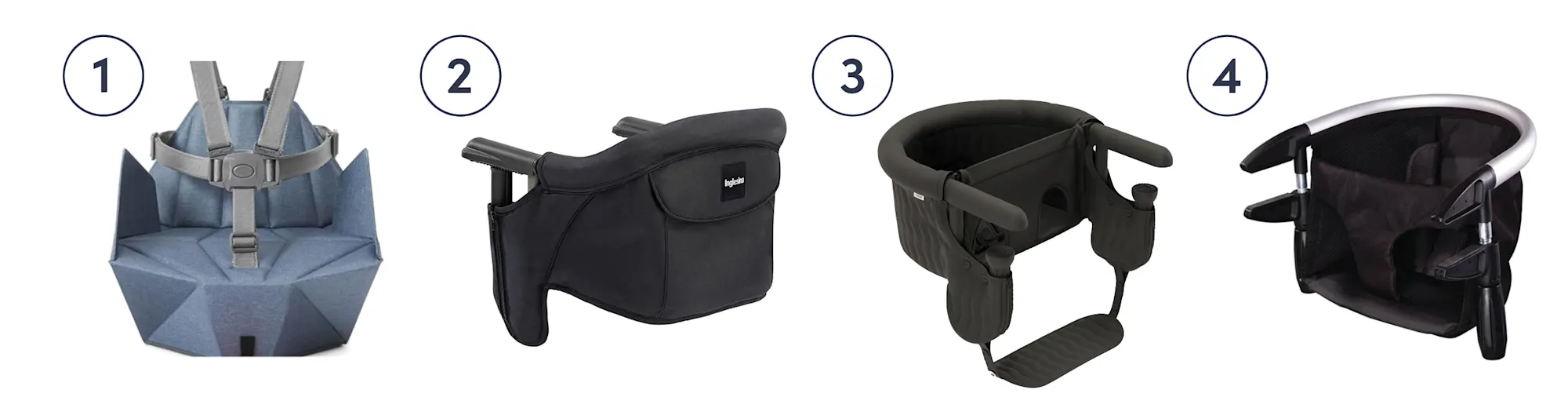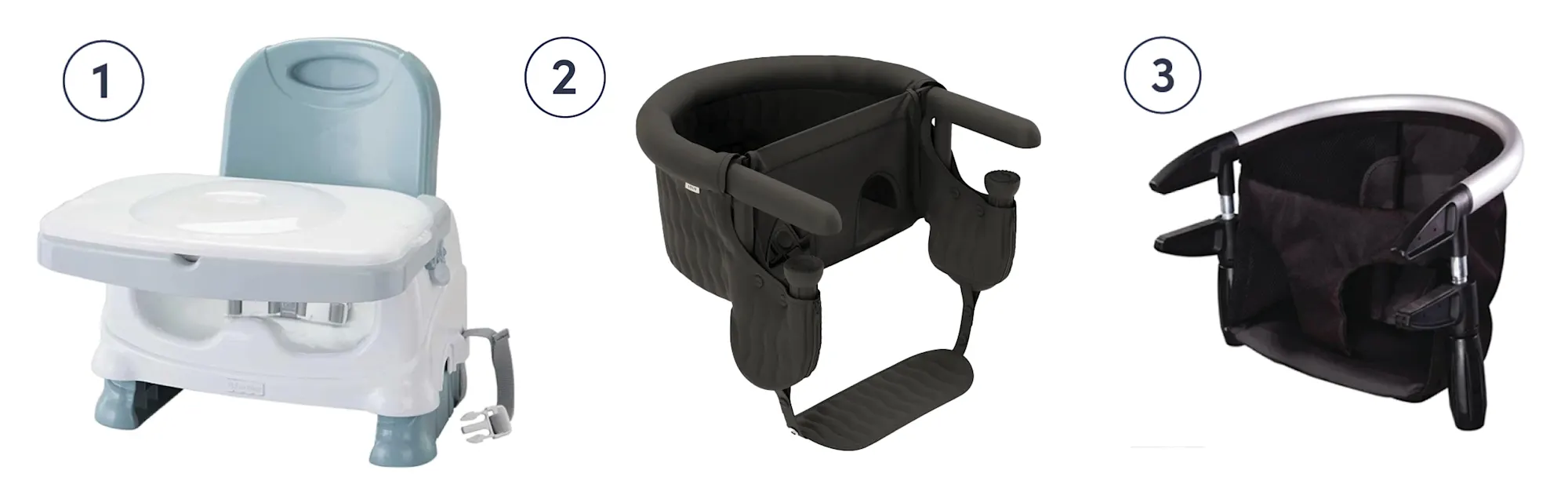Various chairs on the market are made for small spaces, some of which are suitable for the floor, on a regular dining chair like a booster seat, or on a countertop. Below are some of the most popular space-saving high chairs. Keep in mind that these chairs lack some crucial safety components for starting finger foods. Please read the sections above for how to modify chairs for safety.