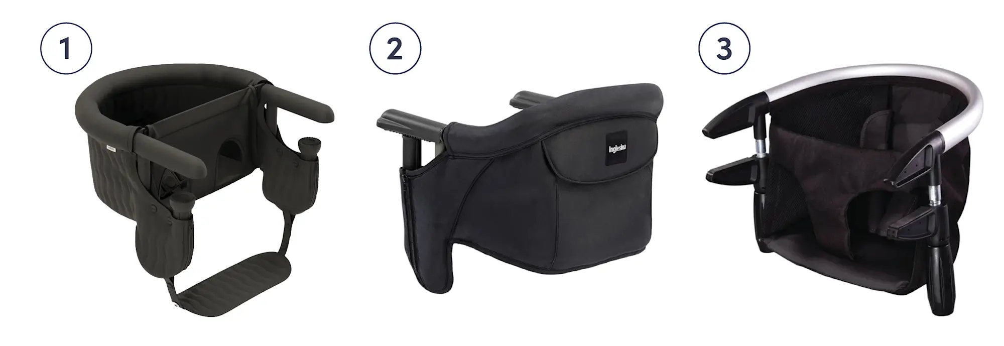 These low-cost chairs are another popular option for families with small spaces. They come with a three-point safety harness, removable trays, and transition into booster seats. The seatbacks are completely upright. When sitting in these chairs, a baby’s knees tend to lay straight, supported by the chair seat, and there is no footrest. The max weight for these chairs is 50 lbs.