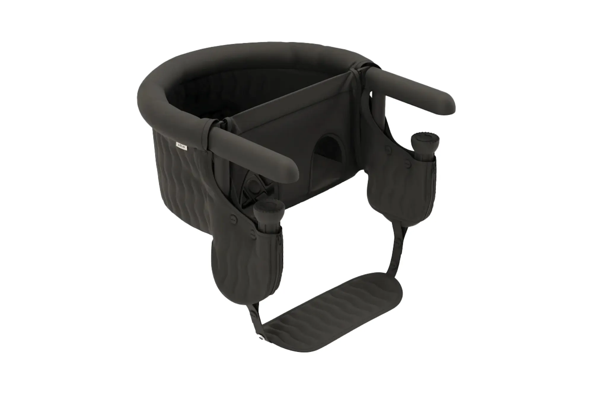 Lalo has upped the ante when it comes to high chairs for small spaces or travel. The chair is easy to put together and hangs from a table or countertop, and folds down and packs away easily in the included travel bag for on-the-go use. It has a three-point safety harness, removable, FDA approved food grade silicone tablemat, and firm plastic seat. While the chair is fabric, it does wipe down and is machine washable. The seat is smaller than other hanging chairs on the market allowing for better support for smaller babies, but some may still require a towel roll to help them sit well. Unlike any other travel or hanging high chair, this chair has an included adjustable footrest for baby! The max weight for this chair is 37 lbs.