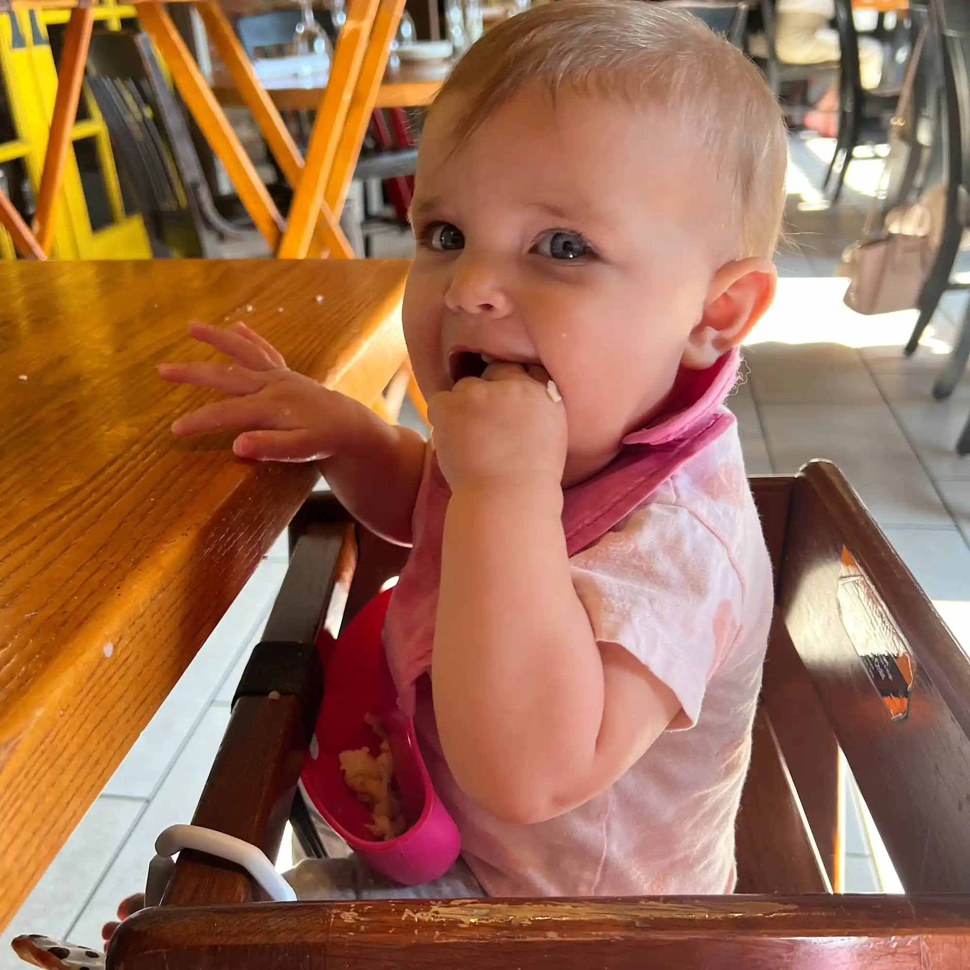 Blythe, 7mos, sits in a restaurant high chair enjoying lunch.